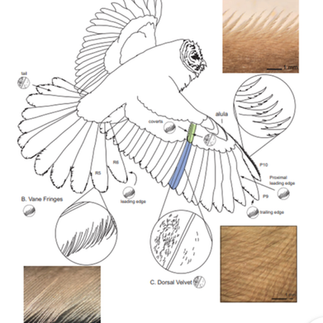 Há cerca de 80 anos, diversos estudos têm buscado responder à uma pergunta: Quais são as adaptações morfológicas únicas presentes nas asas das corujas? De acordo com Graham (1934), a configuração das penas das corujas apresenta três características principais: uma fileira de estruturas semelhantes aos dentes de um pente na margem cranialdas asas (conhecida como leading-edge comb), uma franja flexível na margem caudal (trailing-edge fringe) e uma superfície dorsaldas penas com textura aveludada, semelhante a penugem, que atua na dispersão sonora. Esses elementos, em conjunto, reduzem a turbulência aerodinâmica durante o voo e atenuam a propagação do som, conferindo à ave uma notável furtividade ao se aproximar das presas.
